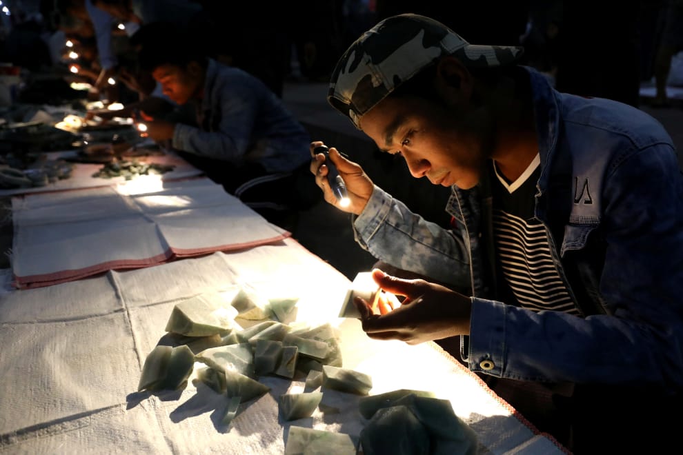 在 27年的時間裡,中研院研究員張雯勤的研究範圍也從泰北的國民黨孤軍,一路延伸到邊境百姓的日常生活,也包括了這裡的毒品、玉石和物資走私貿易。圖為緬甸第二大城曼德勒(Mandalay)的玉市,一名買家正拿著手電筒仔細檢視手上的玉石。