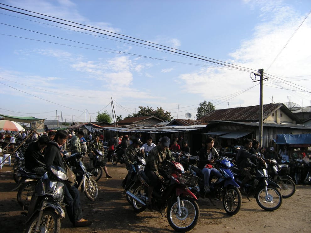 回緬甸不能走正規大路,要趁夜翻山越嶺,路況好的時候,六小時就能抵達緬北臘戌,一路上過村則需要付費給警察。清晨五、六點,臘戌的摩托車市集擠滿了人。除了賣車的,還有販賣偽造車牌的攤位,貴一點用鐵片做,便宜陽春版則是塑膠材質製成。