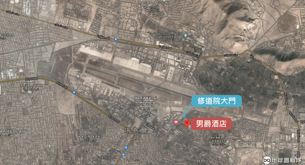 圖為周四喀布爾機場兩起爆炸案的發生地點示意圖。紅色是發生第一起爆炸案的男爵酒店,藍色則是發生第二起爆炸案的修道院大門。