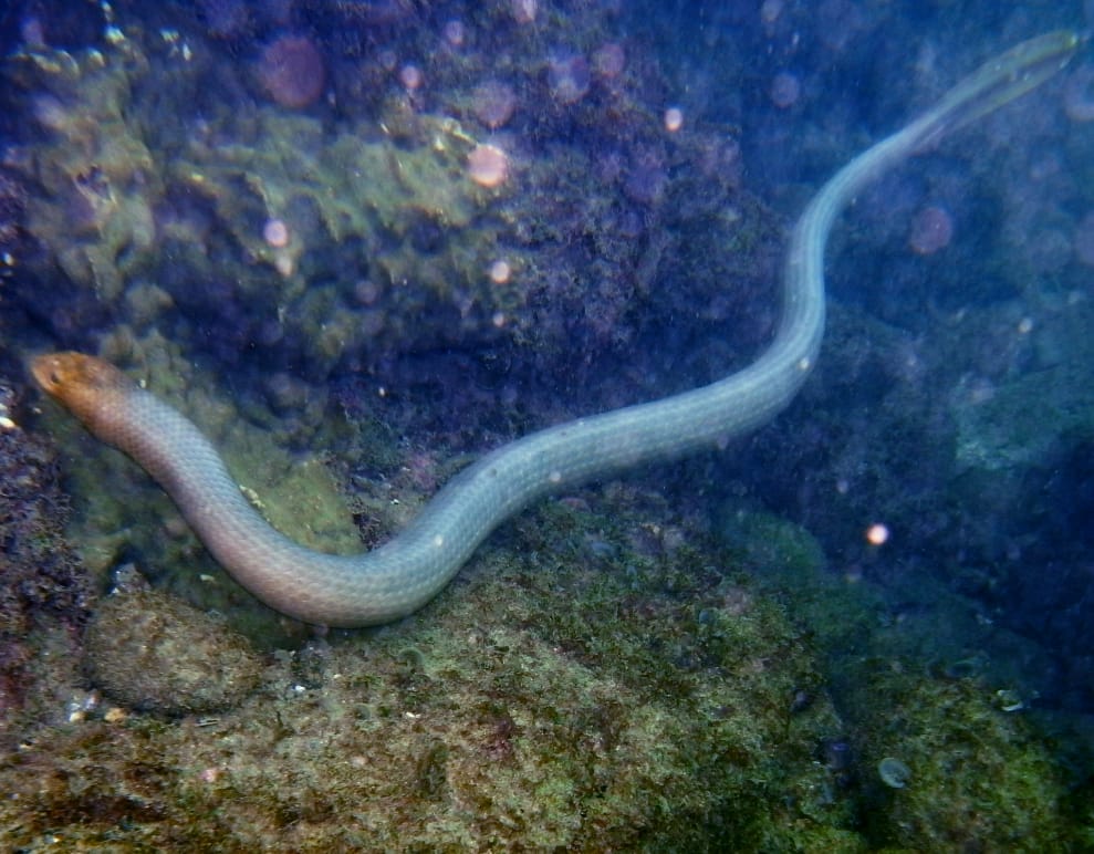 海蛇攻擊潛水員其實相當罕見,據澳洲的資料,除了 1935 年有名潛水員不幸遭海蛇蛇吻致死,直到 2018 年才出現海蛇咬人案例。劍尾海蛇是生活在印度洋、太平洋珊瑚礁的有毒海蛇,頭部佈滿黃褐色鱗片,體背則是淺褐色與紫色鱗片,以甲殼類、魚類魚卵為食,通常不會攻擊人類或主動出擊大型動物。