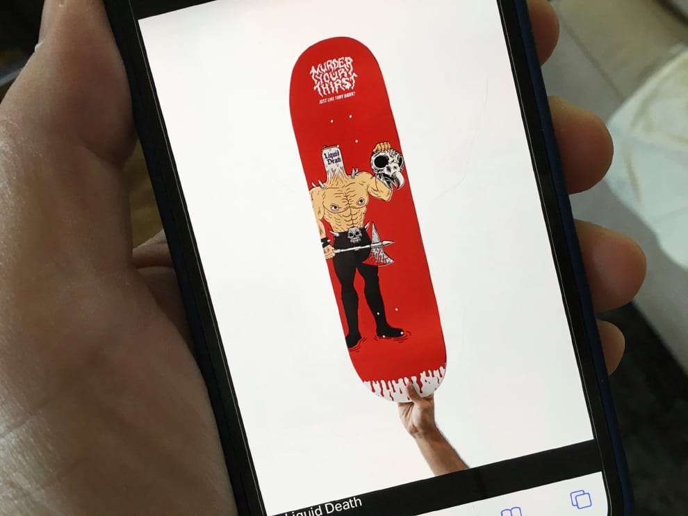 事實上,這並不是霍克一個人的突發奇想,而是他和美國新創罐裝水公司「死亡之液」(Liquid Death)聯名推出的滑板。從宣傳片中可以看見,專家們在取得霍克的血液後,隨即將其倒入紅色漆料中,並將混合後的漆料用來彩繪「霍克鮮血板」,而滑板上頭當然也少不了死亡之液的招牌人物「口渴殺手」以及招牌標語——「殺死你的口渴」(Murder Your Thirst)。