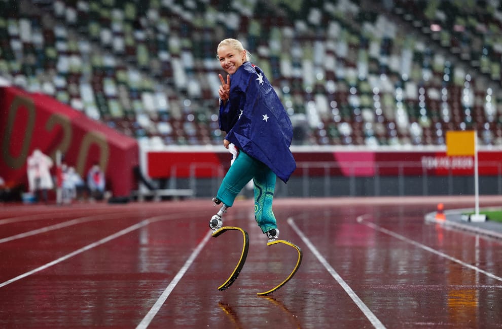 在 2020東京帕奧的會場上,奪下女子跳遠T63級金牌的澳洲選手凡妮莎‧洛(Vanessa Low)身披澳洲國旗拍照。