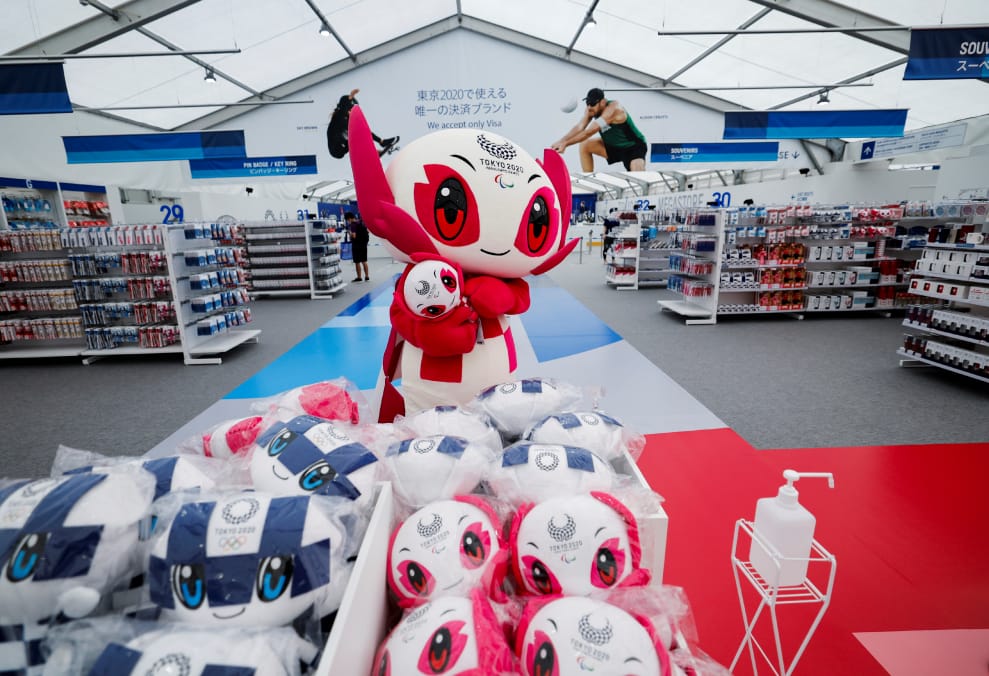 在 2020東京帕奧的紀念品商店內,帕奧吉祥物染井吉抱著娃娃留影。