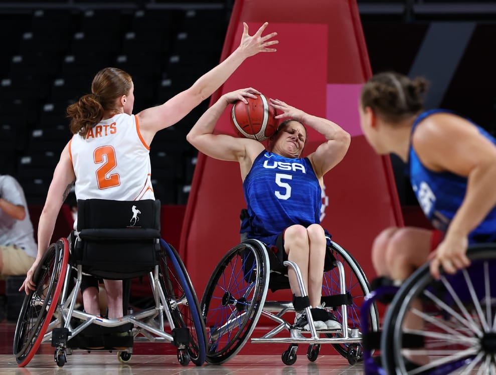 在今年美國對上荷蘭的帕奧女子籃球比賽上,穿著 5號球衣的美國選手杭特正在想辦法通過對方的防守。