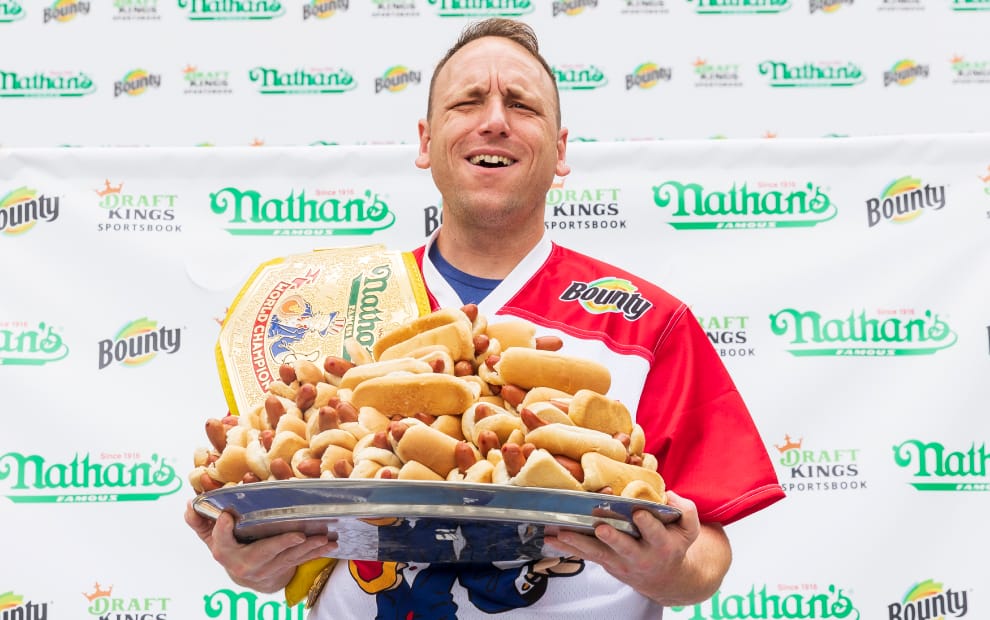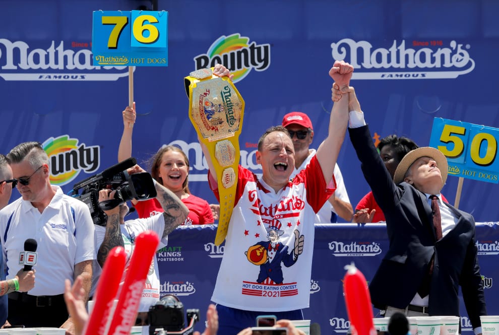 根據研究團隊的估計,多次稱霸美國奈森熱狗大胃王比賽的切斯納特,很可能已經因為將大量的熱狗堡吃下肚,導致壽命減少了約 1年又115天。圖為今年切斯納特再次獲得熱狗大胃王比賽的照片,畫面後面還可以看到評審高舉著切斯納特的成績「76」。