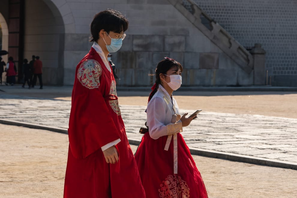 一對情侶穿著傳統韓服走在首爾的景福宮內。經由Seon認識的情侶,往往很快就步入結婚禮堂。