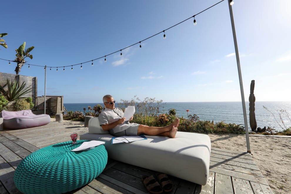 隨著疫情來襲,各大企業紛紛改為在家上班後,讓美國上班族看到了不一樣的世界。圖為加州巧克力專賣店Chuao Chocolatier的主廚安東諾西(Michael Antonorsi),他在疫情來襲後增加了在濱海的家上班的時間。