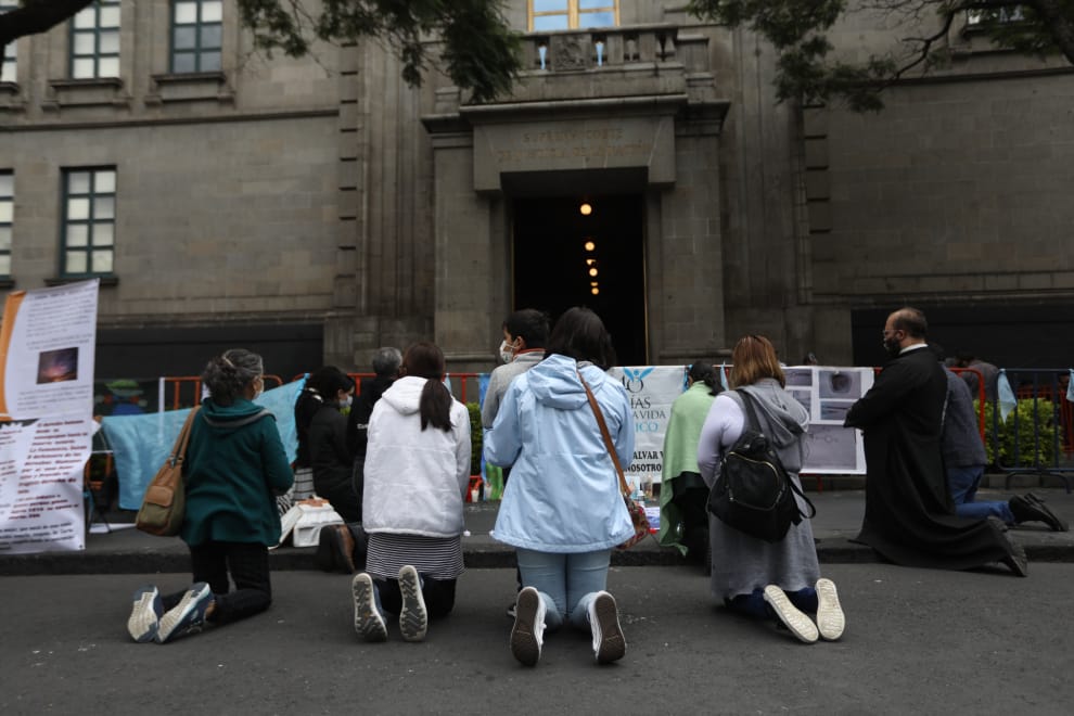 周一(6)在墨西哥最高法院外,反對墮胎的民眾集體跪下祈禱,希望法官們不要做出可能會讓墮胎合法化的決定。