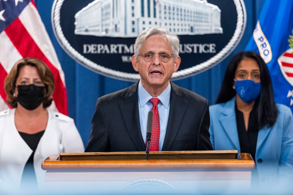 在檢視過美國德州最新的墮胎法案後,美國司法部長賈蘭德(Merrick Garland,中)召開記者會表示,司法部認為德州的新法律有違憲法,因此宣布將對這項法案提起訴訟。