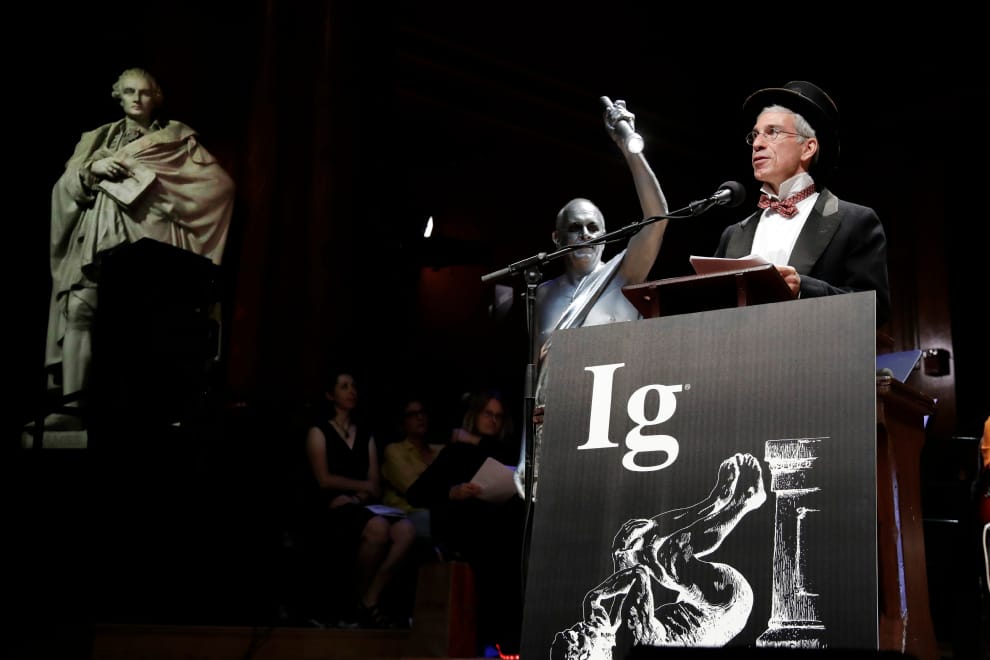 雖然少了很多實體頒獎典禮才有的經典橋段,但得主和主辦單位都再次證明,他們逗人發笑的能力並不會因為頒獎典禮改為線上舉辦而打折。圖為 2019年的頒獎典禮,照片中帶著黑帽的男子就是搞笑諾貝爾獎的創辦人亞伯拉罕斯(Marc Abrahams)。