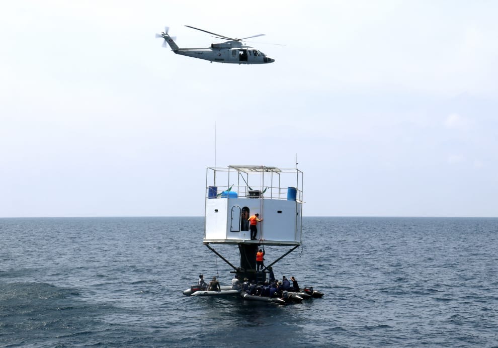圖為艾瓦陶斯基在泰國外海設置的六角形白色小屋,泰國海軍正在執行拆除任務。