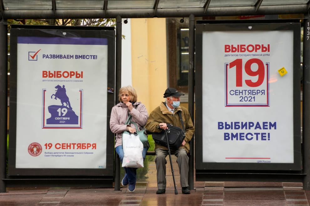 CNN在報導中表示,在俄國的選戰中,這種「候選人分身之術」早已非首次出現。圖為兩位坐在聖彼得堡公車站的民眾,他們身旁的廣告就是本次俄國議會大選的廣告。