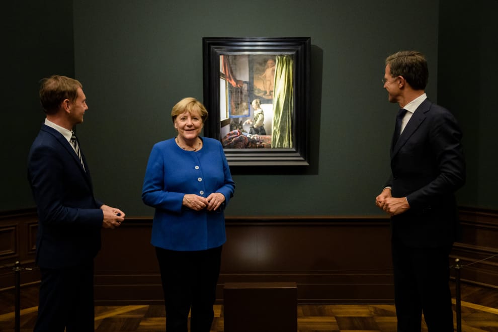 今年 9月9日,德國總理梅克爾(Angela Merkel,中)、荷蘭總理呂特(Mark Rutte,右)和下薩克森邦首長克雷齊默(Michael Kretschmer,左)來到歷代大師畫廊欣賞《窗邊讀信的少女》。