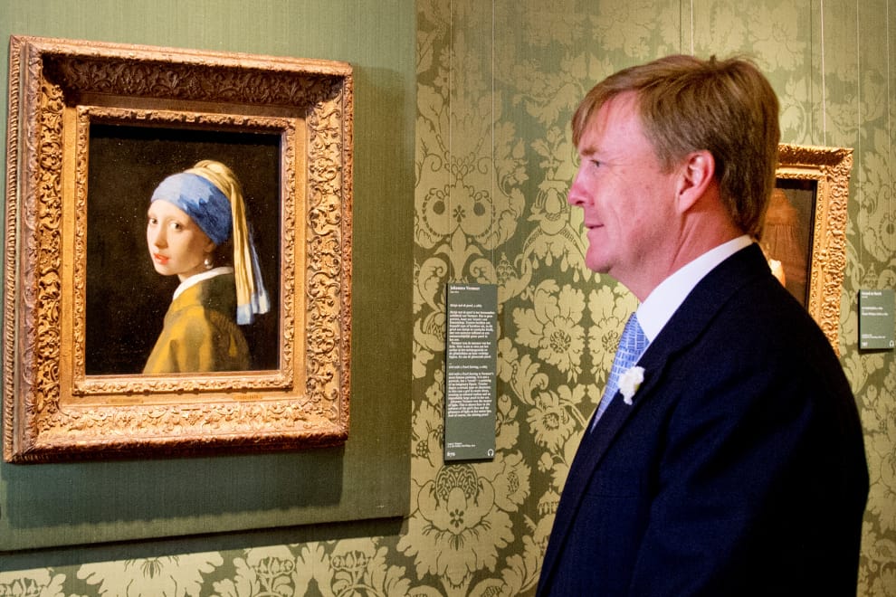 維梅爾的作品《戴珍珠耳環的少女》也充滿謎團,圖為前來荷蘭海牙莫瑞泰斯(Mauritshuis)皇家美術館欣賞該作品的荷蘭國王威廉-亞歷山大(Willem-Alexander of the Netherlands)。