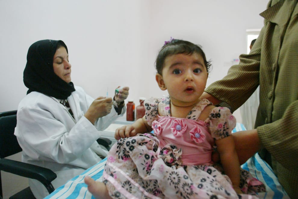在伊拉克巴格達的一間診所中,一名醫生正在替小女孩準備要施打的疫苗,其中就含有B型肝炎疫苗。