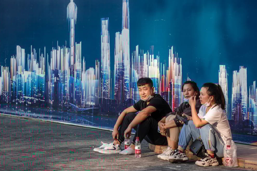在位於上海的恒大中心外頭,一群民眾坐在地上。在房市泡沫化後,原本深信房價會不斷上漲的中產階級民眾開始勒緊褲帶、抑制消費,進一步衝擊全球消費市場。