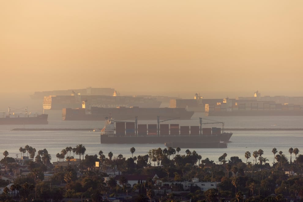在貨櫃航運供需嚴重失衡下,近期海運的運價進入了一個齊聲喊漲的時代。圖為貨輪在美國加州長灘(Long Beach)地區的一座港口外大排長龍的照片。