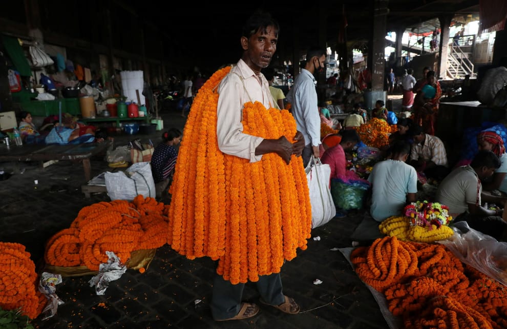 在印度大城加爾各答市(Kolkata)的花市裡,一名小販將一束束萬壽菊花環掛在身上,等著顧客上門購買,當作廟宇、住宅在杜嘉女神節(Durga Puja festival)期間的裝飾。
