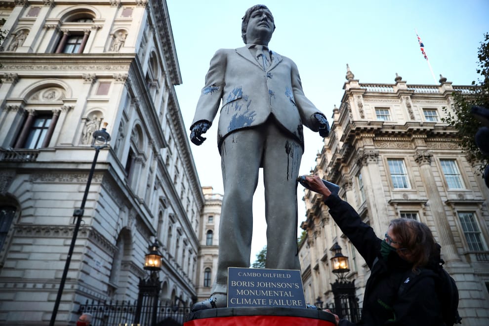在英國首都倫敦的首相官邸外,綠色和平組織(Greenpeace)的成員在這裡立起了一尊英國首相強生(Boris Johnson)的雕像,並朝著他身上傾倒油汙,抗議他發放鑽探許可,允許石油公司開採位於英國北部謝德蘭群島(Shetland Islands)的坎博油田(Cambo oilfield)。