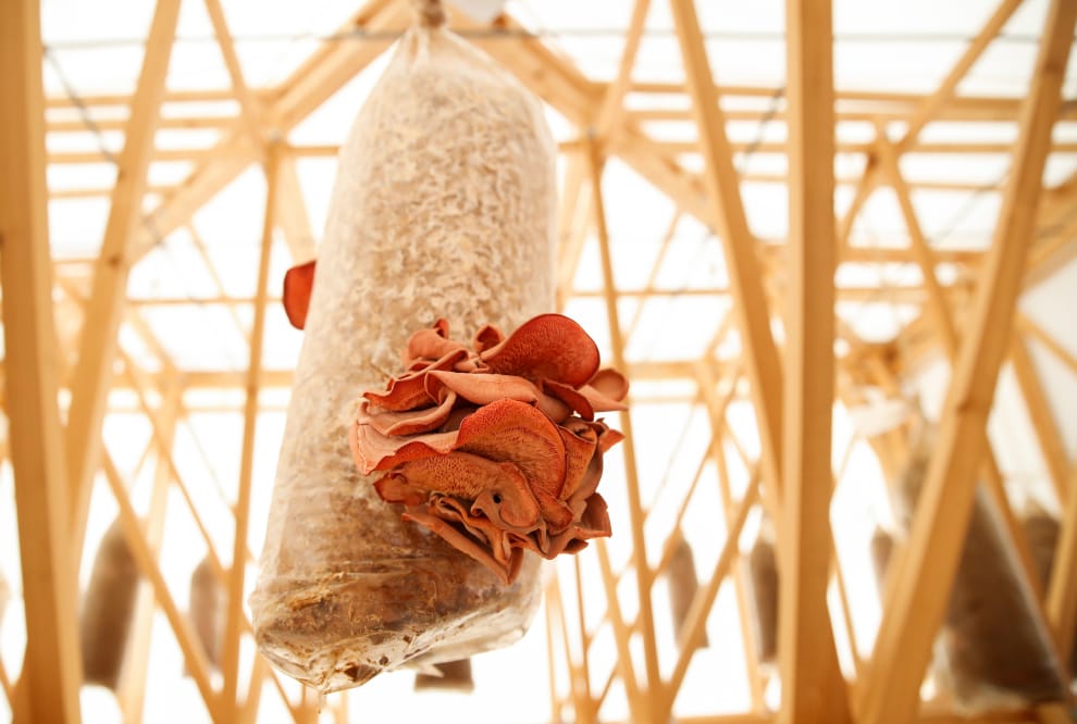 在英國南部的米爾頓凱恩斯鎮(Milton Keynes),藝術家格林福特(Tue Greenfort)、策展人里納爾迪(Aldo Rinaldi)和早津建築事務所(Hayatsu Architects)攜手策劃了一檔公共藝術展覽〈The Modernist Glade〉,而在展區「蘑菇亭」(The Mushroom Pavilion)當中,攝影師將鏡頭對準了一株在空中肆意生長的秀珍菇(Pleurotus ostreatus)。