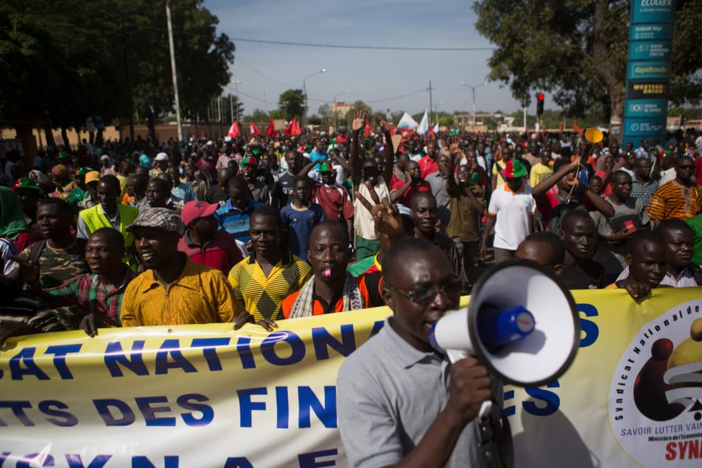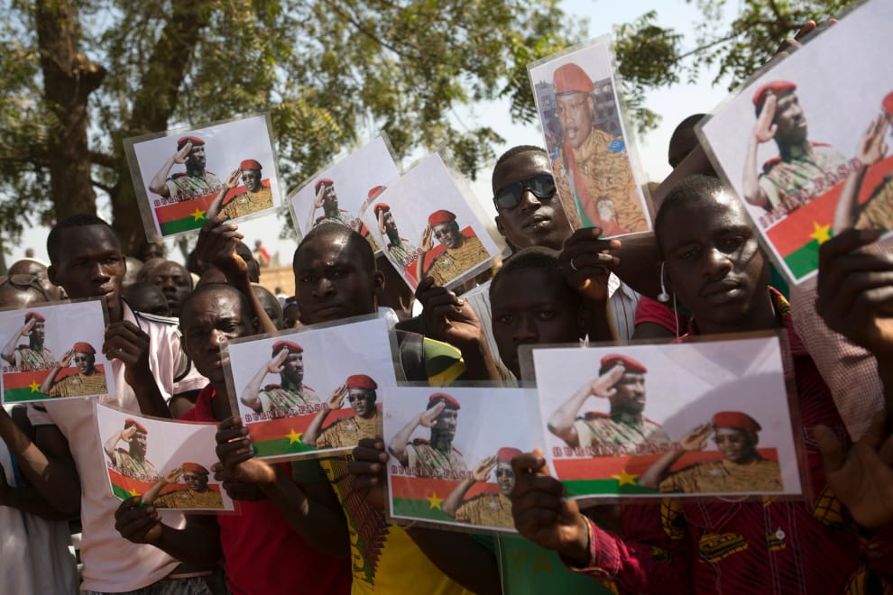 2014年10月,為了抗議並反對時任總統龔保雷,布吉納法索多個城市掀起大規模起義行動,龔保雷最後於同月底辭職下台。本照攝於該年 12月2日,民眾正在為因起義而死的六人舉辦喪禮,並於喪禮時高舉遭暗殺的前總統桑卡拉(圖卡中左方)與時任總理席達(Isaac Zida,圖卡中右方)的照片。