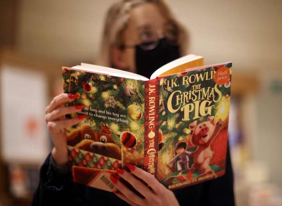 在首都倫敦的一間書店中,一名店員正在翻閱JK羅琳(JK Rowling)所撰寫的最新兒童文學著作《聖誕節小豬》(The Christmas Pig,暫譯)。