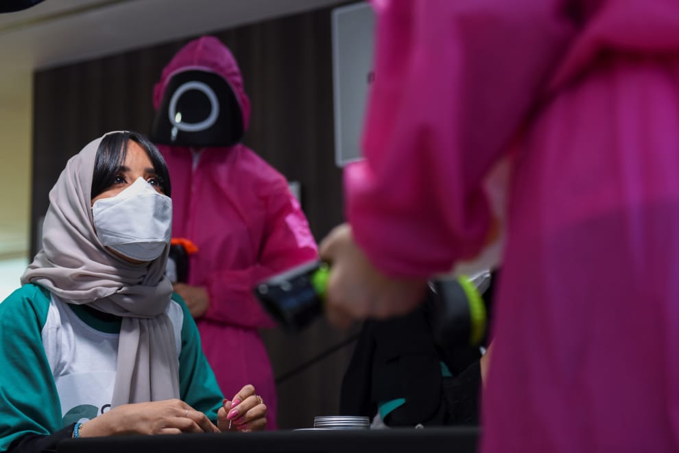 在首都阿布達比(Abu Dhabi),韓國文化院(Korean Cultural Center)以近日爆紅的Netflix韓國影集《魷魚遊戲》為參考,設計了一系列的關卡讓當地民眾挑戰。畫面中,一名參賽者正在嘗試椪糖遊戲,並看向了裝扮成《魷魚遊戲》中工作人員模樣的關主。