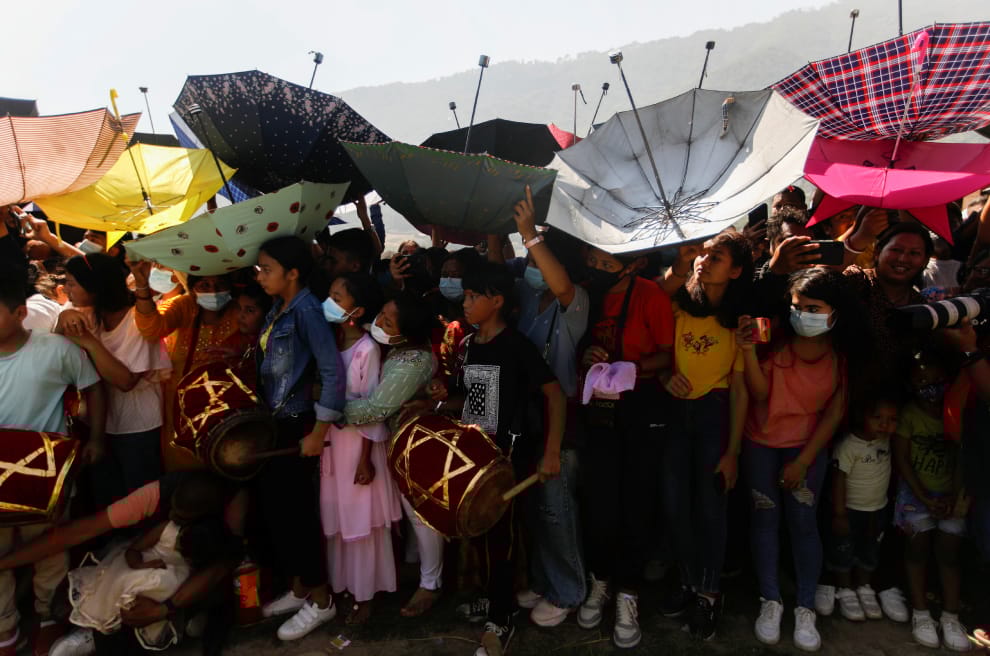 在北部城市拉立特普爾(Lalitpur)的科卡納村(Khokana),當地民眾正在慶祝宗教節日「什卡利節」(Shikali festival)。畫面攝於慶典當下,人們將自己的傘倒著展開,好承接遊行途中沿路撒下的祈福米粒。