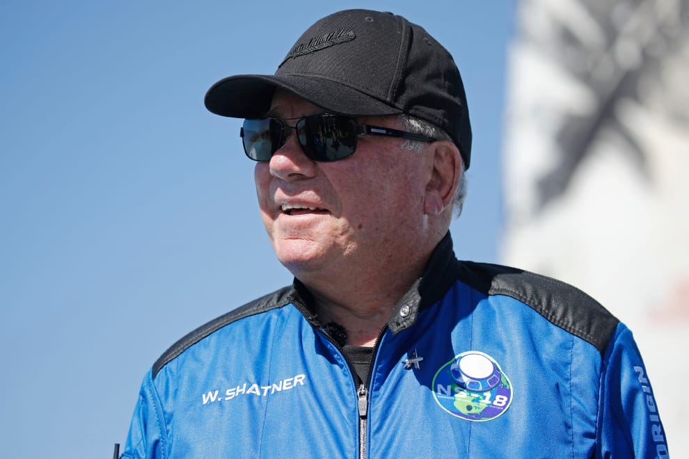 在美國德州的范霍恩小鎮(Van Horn),今年高齡 90歲、曾在電影《星際爭霸戰》(Star Trek)中飾演太空船企業號(NCC-1701)艦長寇克(James Tiberius Kirk)的演員薛特納(William Shatner)在搭乘藍色起源的太空船進入太空後,於白色的火箭前方接受媒體的採訪。