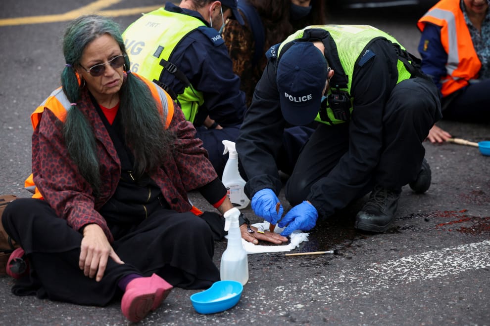 在英國首都倫敦的瑟羅克區(Thurrock),兩名警察千方百計地想將環保組織英國絕緣(Insulate Britain)成員自行黏在路上的手拔起來,好讓車輛通行。