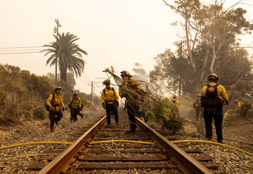 在美國加州的聖塔芭芭拉郡(Santa Barbara County),消防員扛起被野火燒毀的樹木,行經瑞福吉奧州立海灘(Refugio State Beach)附近的一段鐵軌。