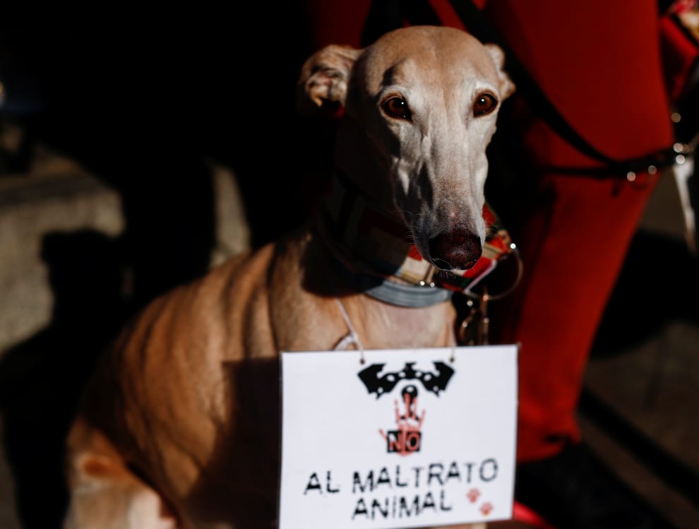 在西班牙首都馬德里,一名狗狗帶著一塊寫著「不要虐待動物」(No animal abuse)的牌子,跟著身為動保團體一員的主人上街發動示威。