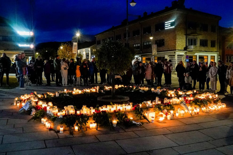 在挪威南部的孔斯貝格市(Kongsberg),人們在鎮廣場中間擺放花朵和蠟燭,悼念在周三的攻擊事件中身亡的遇難者。