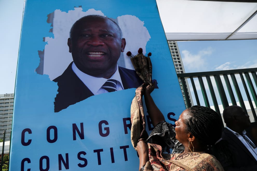 在象牙海岸首都阿必尚(Abidjan),象牙海岸前總統巴波(Laurent Gbagbo)的支持者在走進索菲特酒店(Sofitel hotel)參與新政黨成立大會前,經過了一張巴波的海報。
