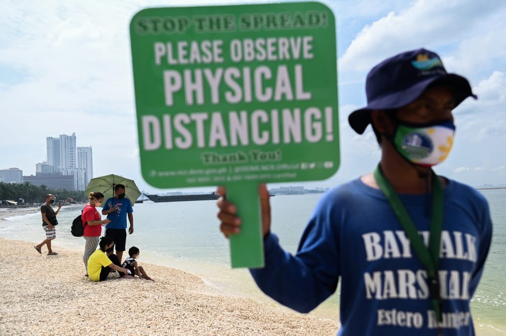 在菲律賓首都馬尼拉(Manila),隨著當地COVID-19疫情趨緩,政府也放寬了防疫規定,開放民眾可以到海邊一遊。但在 15號這天,沙灘上還是依舊出現了一名舉著「請留心保持社交距離!」(physical distancing)的工作人員,提醒來到馬尼拉灣(Manila Bay)的遊客注意防疫規定。