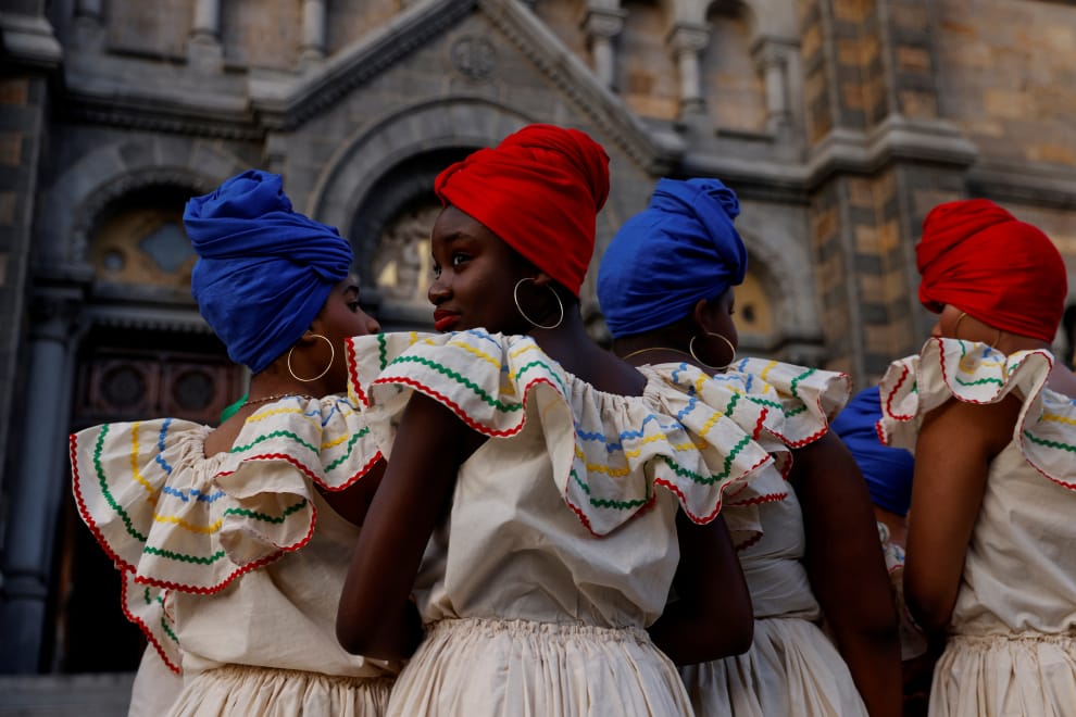 在美國麻州波士頓市(Boston)的傳教山社區(Mission Hill neighborhood),四位海地舞團的成員在永援聖母朝聖地聖殿(Boston's Basilica of Our Lady of Perpetual Help)的後台準備,等著待會在社區COVID-19疫情後的首個大型年度活動上表演。