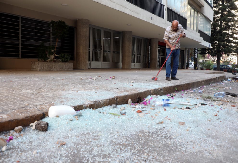 本照畫面攝於槍戰隔日,貝魯特當地居民正在街邊打掃碎成一地的玻璃。