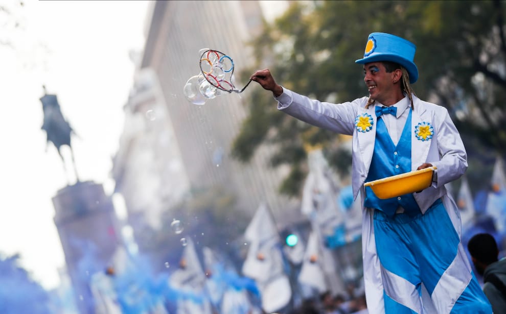 在阿根廷首都布宜諾斯艾利斯市(Buenos Aires),示威者在街頭舉辦遊行活動,展現他們對現任阿根廷總統費爾南德斯(Alberto Fernández)的支持,同時也紀念有 76年歷史的忠誠日(Loyalty Day)。而在示威人群當中,一名街頭藝術家則帶了一盆泡泡水,在人群中吹出一個又一個的泡泡。