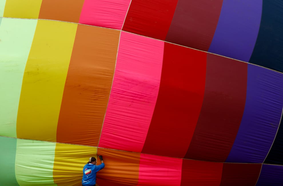 在巴西南部南里約格蘭德州(State of Rio Grande do Sul)的托雷斯市(Torres),第 34屆巴西熱氣球錦標賽(34th Brazilian hot-air balloon championships)的工作人員正在檢查一個充氣中的熱氣球。與巨大的熱氣球相比,他的身影顯得特別嬌小。