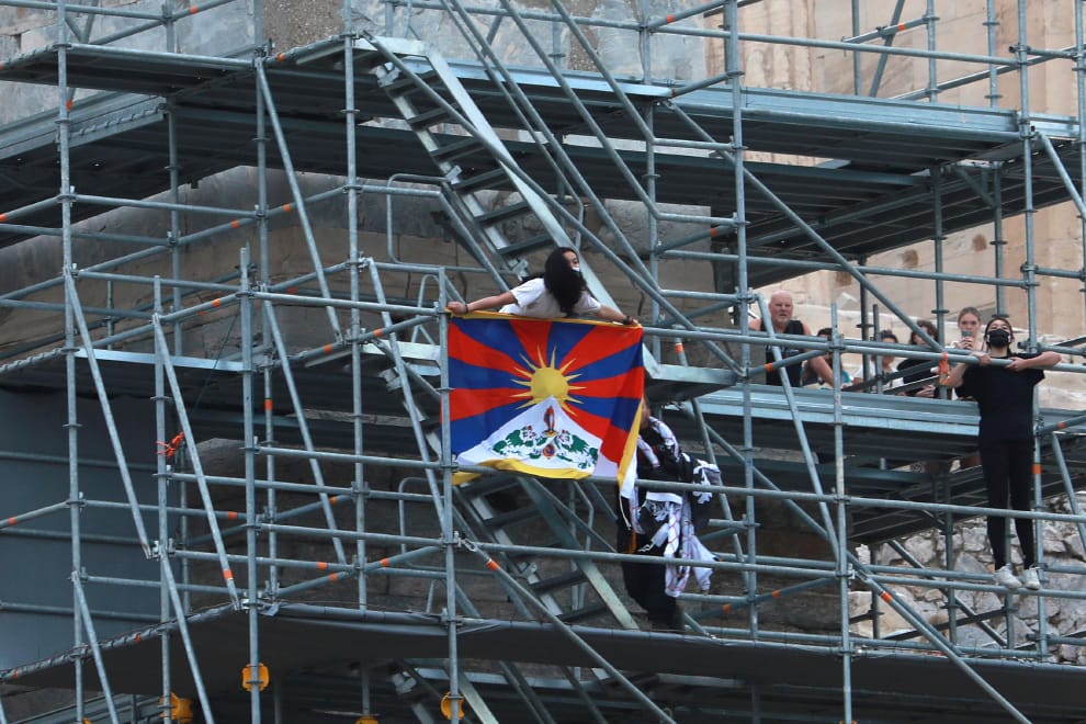 在希臘首都雅典,示威者把握當局彩排 2022年北京冬奧迎聖火儀式的機會,在雅典衛城山門(Acropolis Propylaea)附近的鷹架上高掛起西藏的雪山獅子旗和「光復香港,時代革命」的旗幟,呼籲各國攜手抵制 2022年北京冬奧。