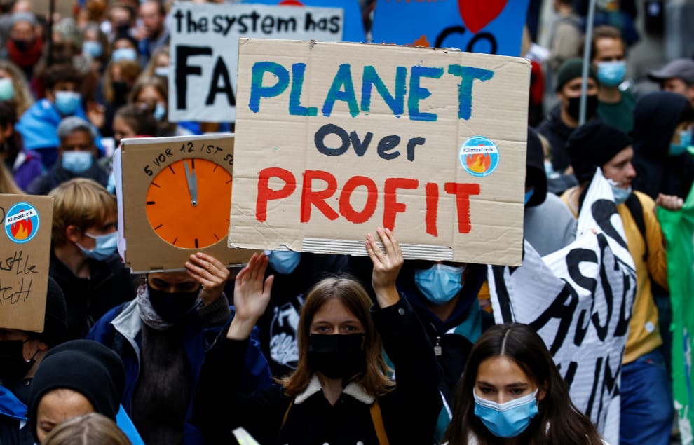 在瑞士大城伯恩(Bern),參加「Fridays For Future 為氣候罷課」示威活動的示威者,帶著寫著「星球高於利潤」的標語,上街為全球氣候變遷問題發聲。