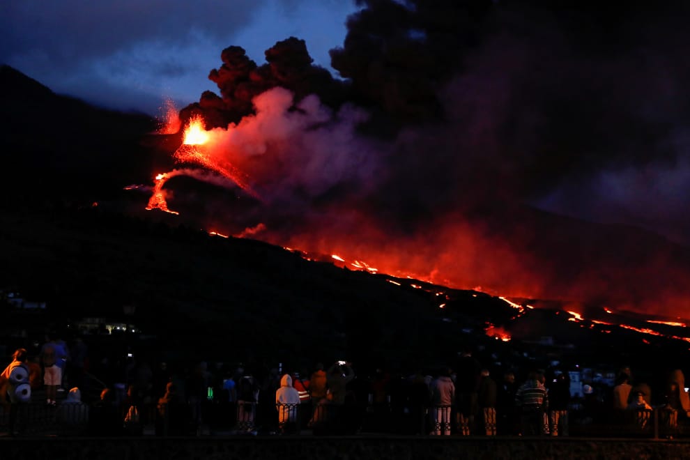 在西班牙的帕爾馬島(La Palma),人們隔著好一段距離,謹慎地觀看老峰火山(Cumbre Vieja)噴發中所流出的岩漿和煙氣。