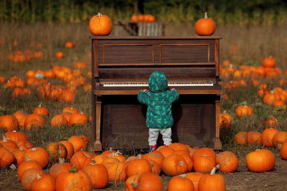 在英國南部聖奧爾本斯郡(St Albans)的佛雷斯達鎮(Flamstead),一名小男孩朝著「彈出農場」(The Pop Up Farm)南瓜園裡的一座鋼琴伸出雙臂,準備要大顯身手。