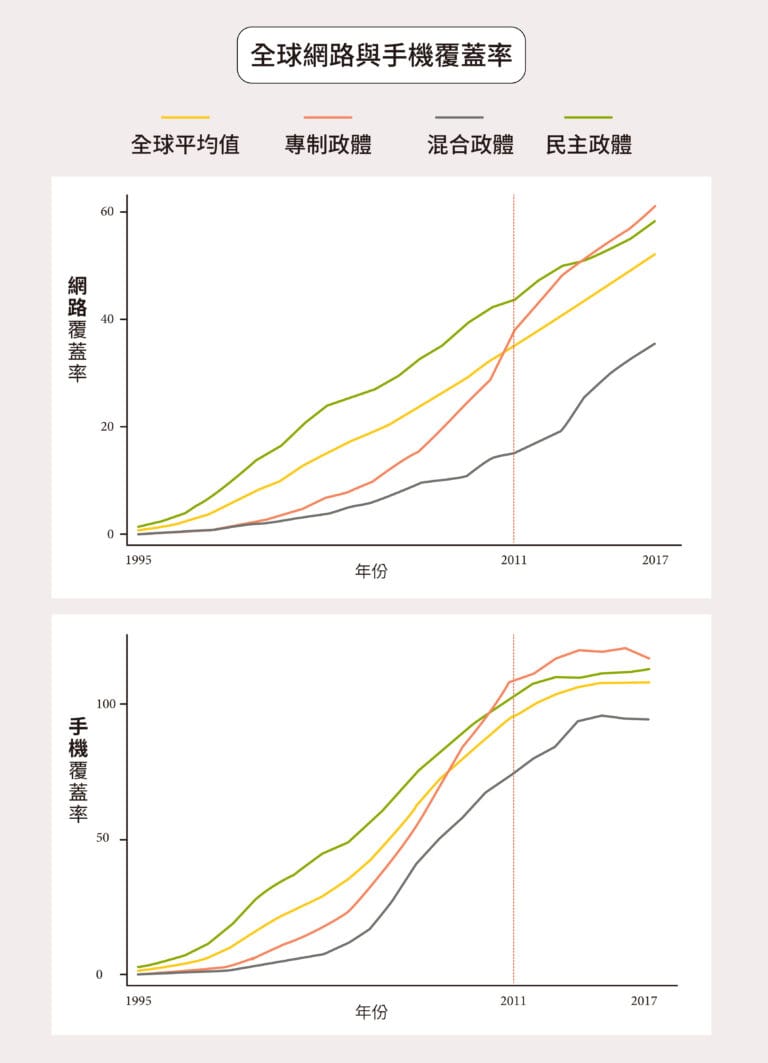 圖為全球 153 個國家的網路、手機覆蓋率趨勢。2010 年前,威權政體的網路、手機比例還遠低於民主國家,其後迅速增加,分別在 2013、2010 年超過民主國家。