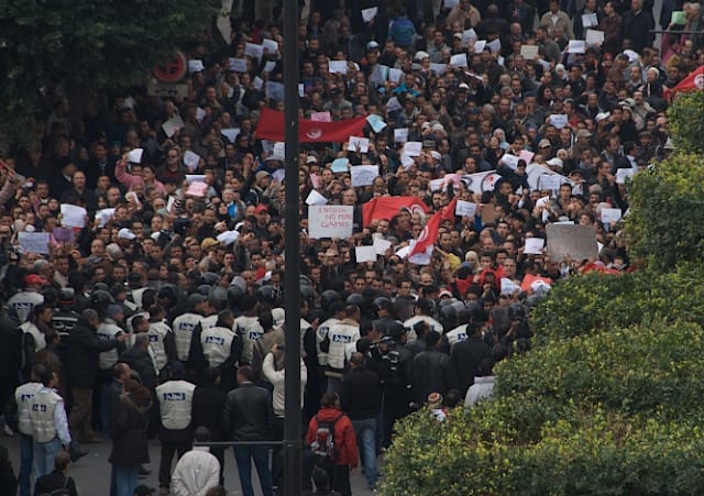 2010 年底突尼西亞爆發茉莉花革命,甫崛起的行動網路與社群媒體成為助力,民眾透過手機迅速串連,分享圖片、資訊,掀起北非與中東地區一連串的民主抗爭運動,多國獨裁政權垮台,被稱為「阿拉伯之春」。圖為 2011 年埃及街頭抗議民眾。