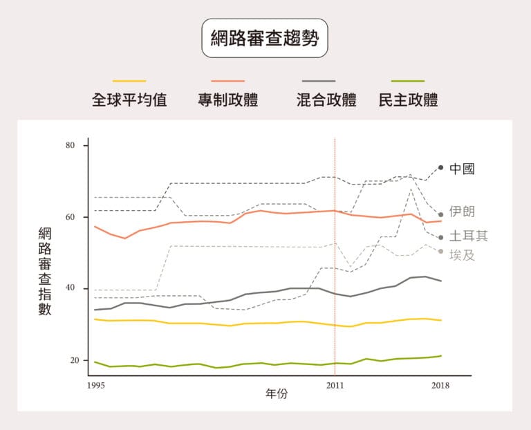 2011-2018 年全球網路審查提高了 5.6 %,中國、伊朗、土耳其、埃及為審查成長最快的四個國家,轉折關鍵大約在 2010-2011 年阿拉伯之春以後,諸如茉莉花革命等關鍵字會遭到屏蔽。