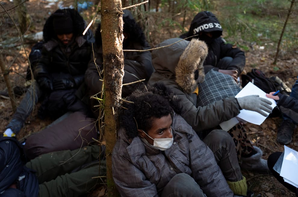 在波蘭東部,靠近白羅斯邊境的小鎮錫米亞諾夫卡(Siemianowka),一群來自索馬利亞的難民們坐在地上,靠著樹幹圍成一圈。