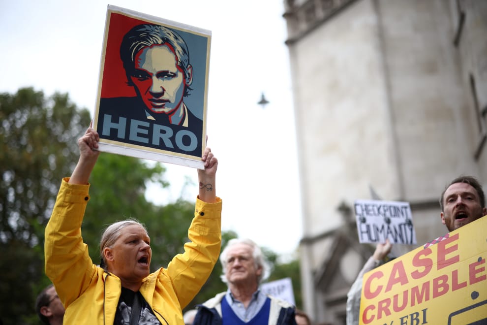 在英國首都倫敦,支持維基解密(Wikileaks)創辦人阿桑奇(Julian Assange)的民眾在皇家司法院(Royal Courts of Justice)外,高舉著一幅將阿桑奇形容為「英雄」的標語聲援他。