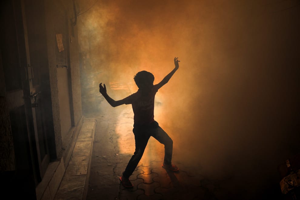 在印度首都新德里,一名孩子在殺蟲劑噴出後所形成的煙霧裡玩得不亦樂乎。