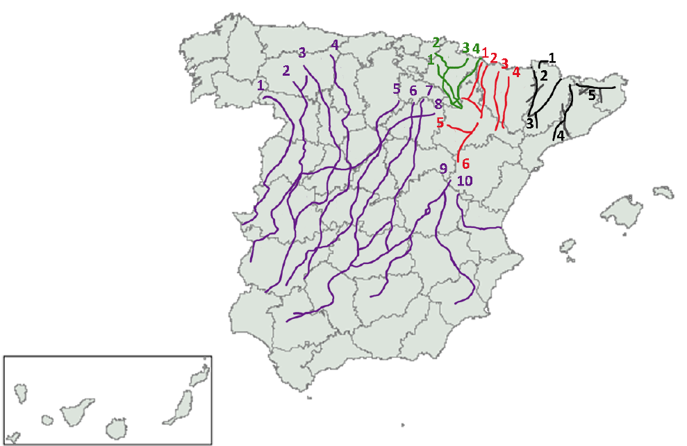 西班牙境內,幾條主要的遷徙放牧路徑,幾個顏色代表不同的地區。